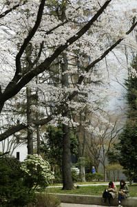 公園の桜を見ながらランチしているOLさんです。