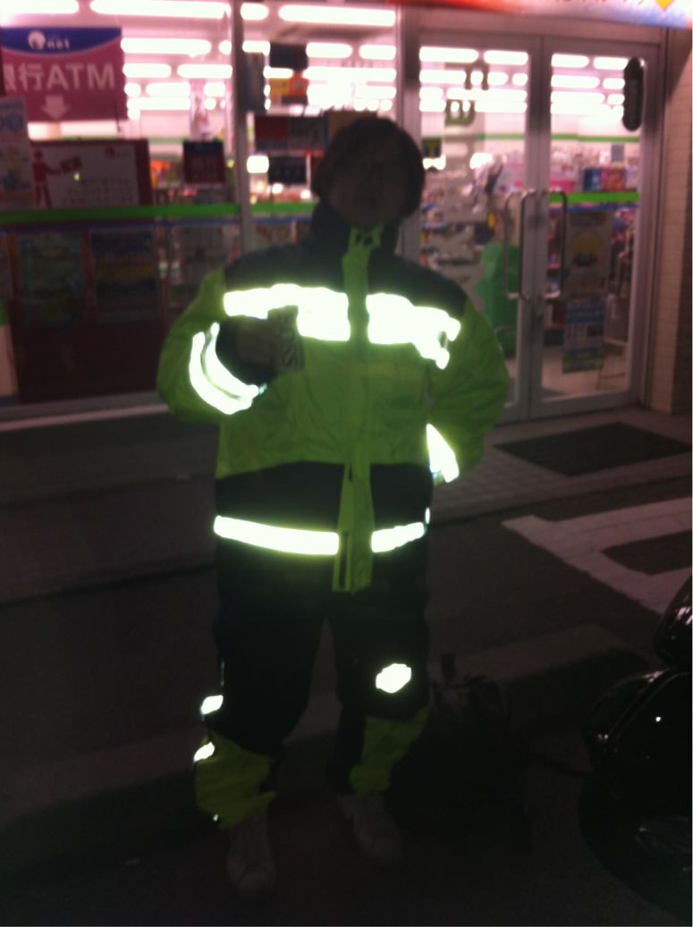 日が暮れて、パッセンジャーが寒いというので、あのカッパを貸しました。